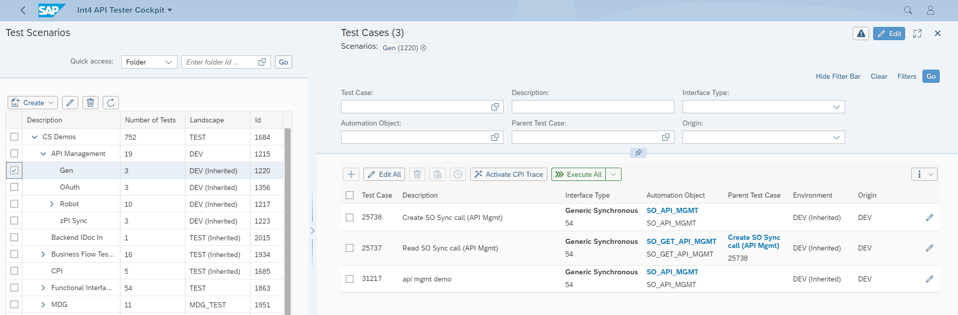 The navigation follows typical SAP Fiori and web-application approach, featuring expandable and selectable folders. Details of navigation are described in the APITester Cockpit Navigation section of this manual.