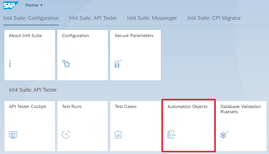 Fiori Launchpad with Int4 Suite tiles, Automation Objects highlighted