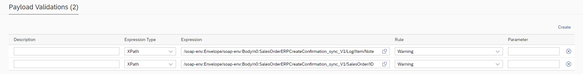 Payload Validation enables additional checks on message content and structure. In this section You can create, edit and delete these rules. Use the “Create” button or the “X” icon for creation and deletion respectively.