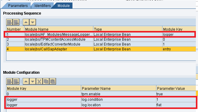 - In the communication channel, add adapter module localejbs/AF_Modules/MessageLoggerBean of type: Local Enterprise Bean and Module key, for example, logger