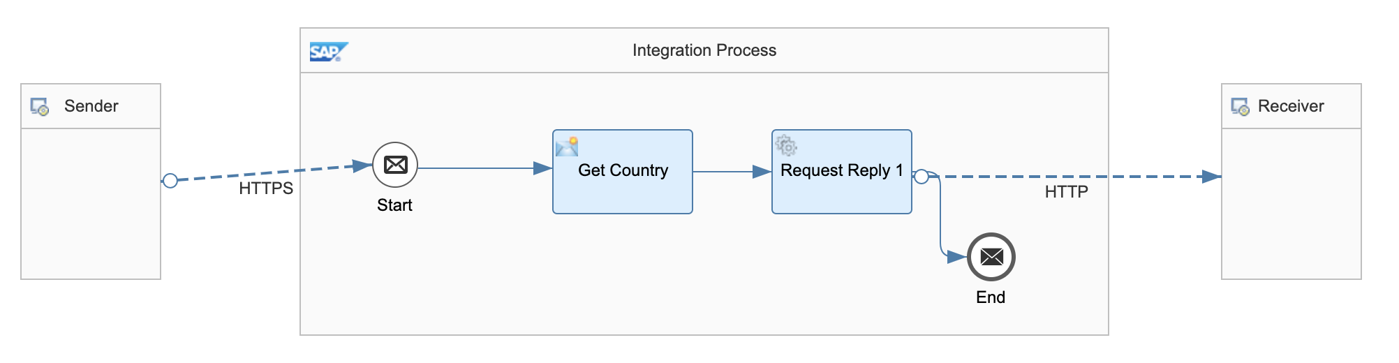 The IFlow needs to be modified to use a Request Reply call instead, with the response routed to the next step to test synchronous response. The following diagram shows an example with a Request Reply, and the response routed to the End event.