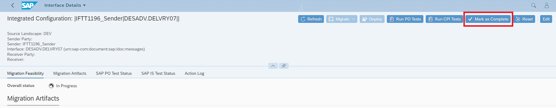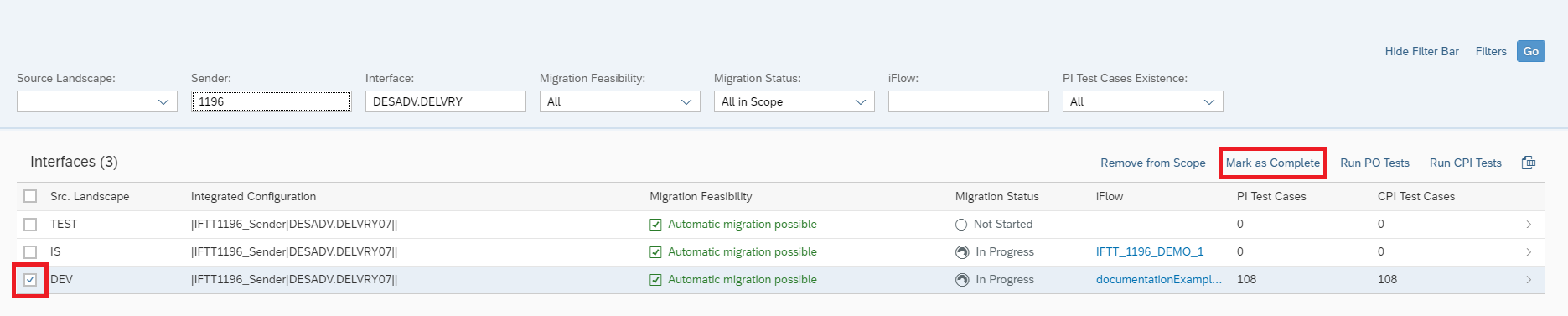 Following successful test execution on development and test environments, migration can be marked as complete for scope tracking and migration status reporting.