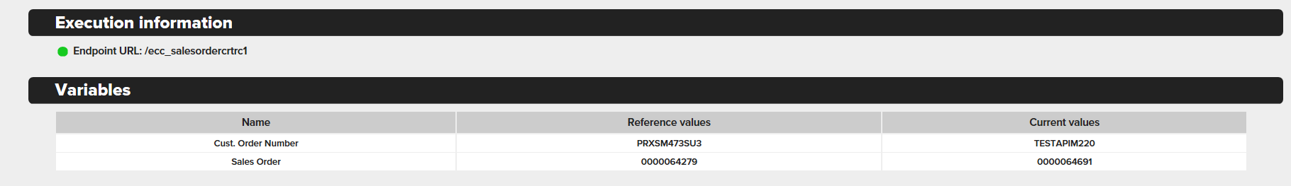 In the execution details, we can see the endpoint URL and the reference and current values for Purchase and Sales Orders.