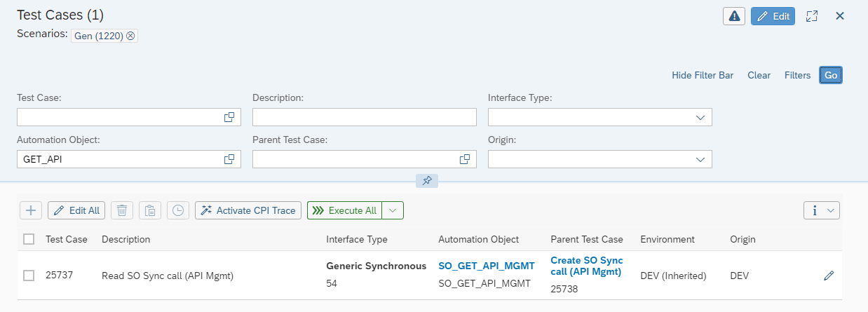 To simplify searches in scenarios or folders containing a large number of test cases, use the Filter feature. Enter your filtering criteria (e.g., part of a description or an automation object name) in the fields above the test case list, click Go, and the displayed list will update accordingly.