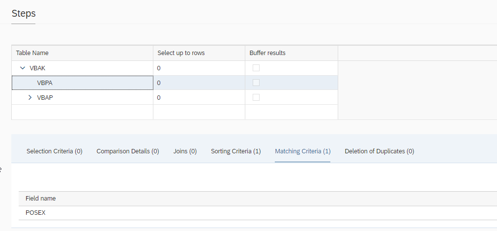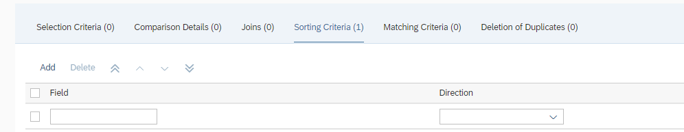 Sorting Criteria is an optional configuration for the comparison of the tables. Suppose you want to make sure that reference and new records are compared in a specific sequence. In that case, you can select fields and sorting direction here. If the configuration is not maintained, no action will be performed.