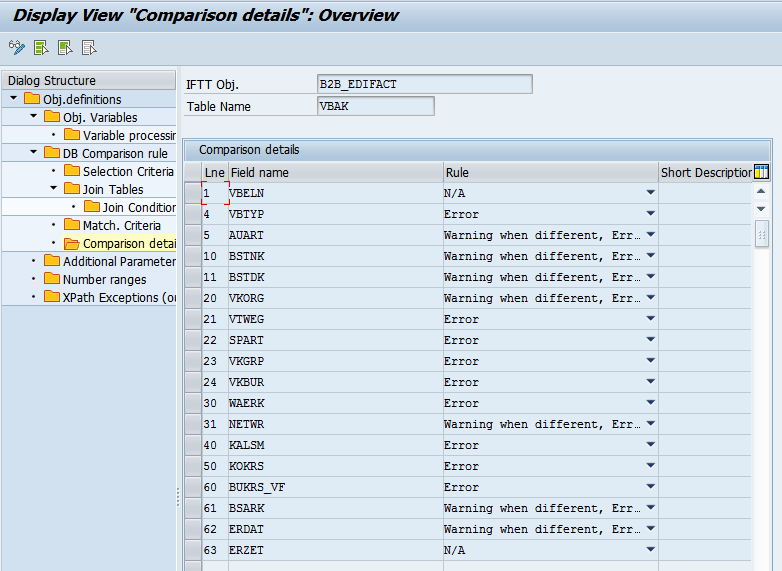 - Define comparison details for the VBAK table: names of the fields to be compared and rules that should be applied.