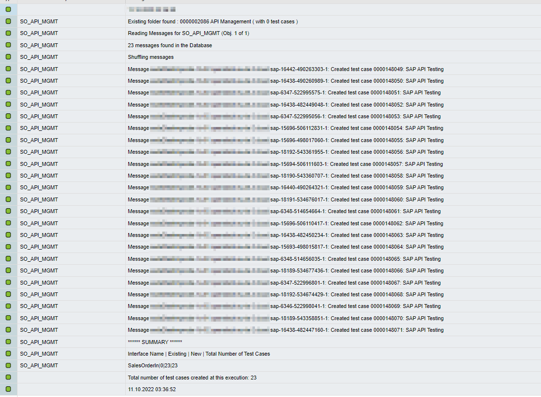 The Robot automatically fetched messages from the Database and creates the folders if needed with test cases based on criteria from the selection screen. You can find a summary at the end of the list. When you open Int4 Suite Cockpit you should find test cases in the specified folder with the additional subfolders.