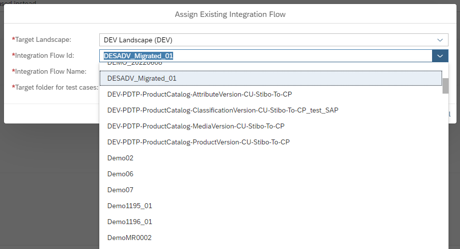 Finally, choose a folder (might need to be created from APITester first) where to place the migrated test cases dedicated to the iFlow. Click on the box on the left of the scenario name to select it.