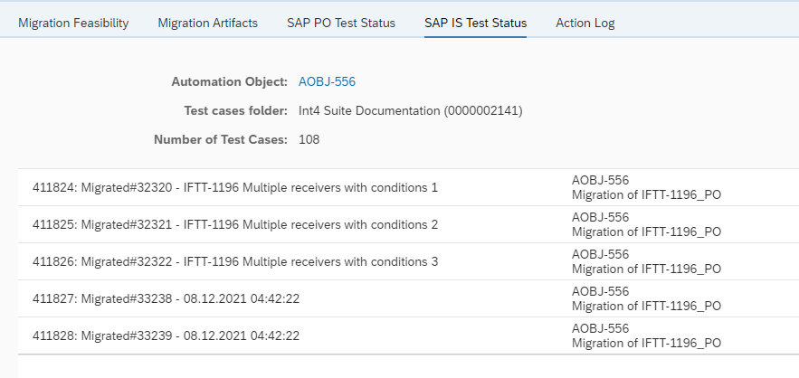 After a moment, the screen refreshes, offering details of the migration artifacts and a view to the migrated test cases.
