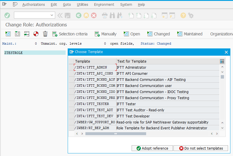 If authorization data for the role already exists, you can add the Int4 Suite authorizations from a template using the menu Edit > Insert authorization(s) > From template…