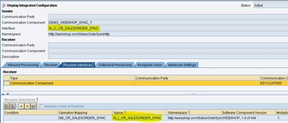 The request message is presented with the "SI_I_CR_SALESORDER_SYNC" interface. The Interface name is the name of Receiver Interface (see above ICO screenshot).