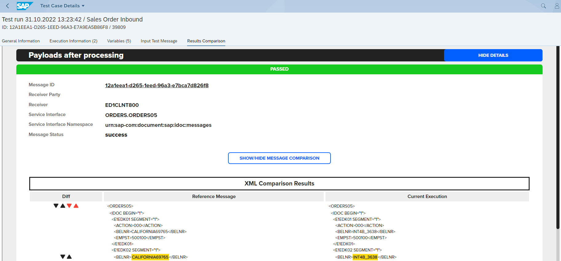 Payload Comparison shows the reference message (on the left) and current execution (on the right) in a structurally aligned way, highlighting the differences.