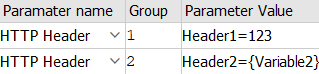To use multiple HTTP headers, a unique identifier in the Group column should be defined for each of them. | Header1=123 (Method 1) or Header2={Variable2} (Method 2) Multiple HTTP headers usage: