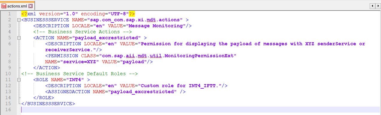 4. Replace the XYZ tag in the actions.xml with the service that should be accessible by this role. If more than one service is required, create separate actions for each service. Then all actions need to be assigned to the role by multiple occurrences of the ASSIGNEDACTION node in the ROLE node.