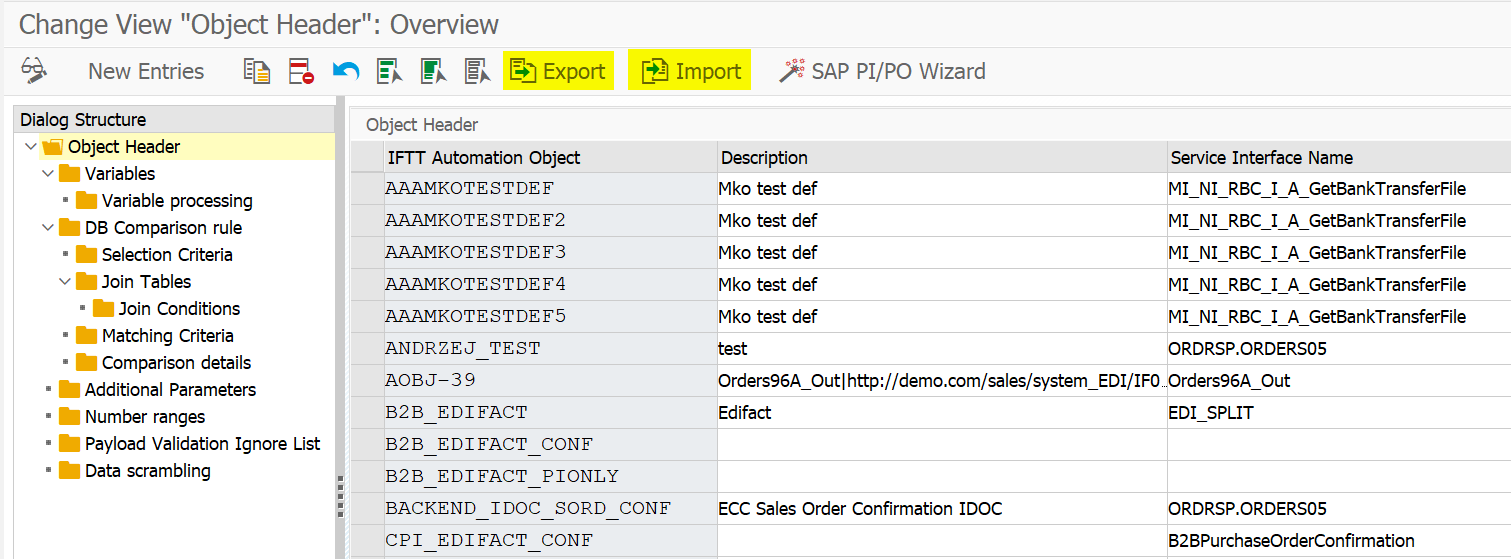 Because transaction allows you to edit multiple settings simultaneously, INT4 strongly recommends creating a copy of your settings before the change. To do so, export your settings using transaction /INT4/IFTT_CONF_MASS. In case of any problems, it is possible to import settings from a previously exported file using the Import button.