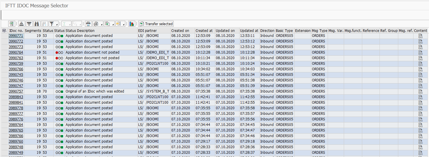 Depending on the number of IDocs we have selected for transfer, many new rows are added to the Test Case list in the Int4 IFTT Cockpit.