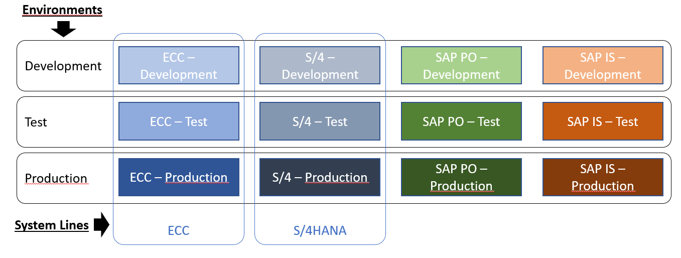 Example of System Lines and Environments for a typical S/4 Migration project with SAP PO and SAP IS (CPI)