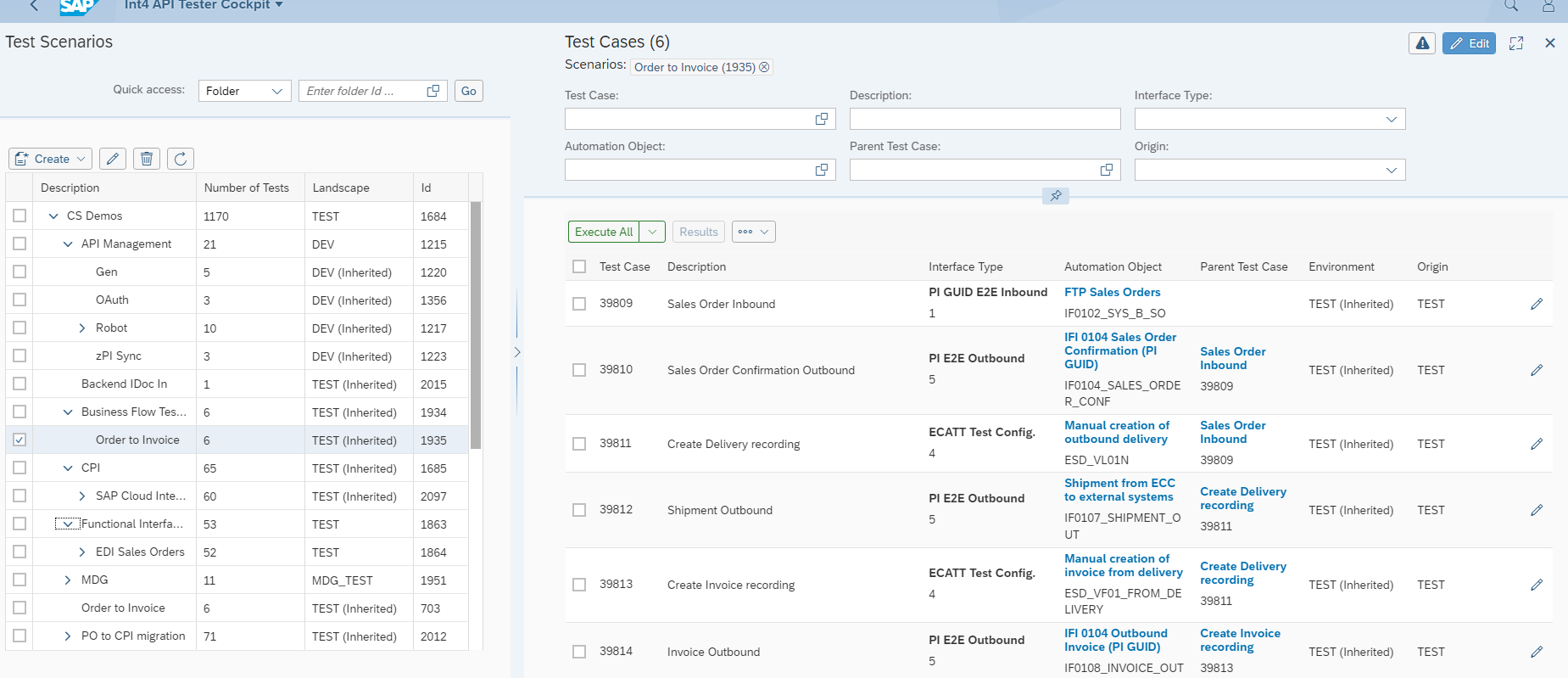 Int4 Suite allows for complex scenarios, with test cases linked, passing data from one test case to another, resulting in ability to test multiple step business processes. Such a test usually requires mixing different testing types (Inbound, Outbound and UI test cases) and requires multiple Automation Objects to run.