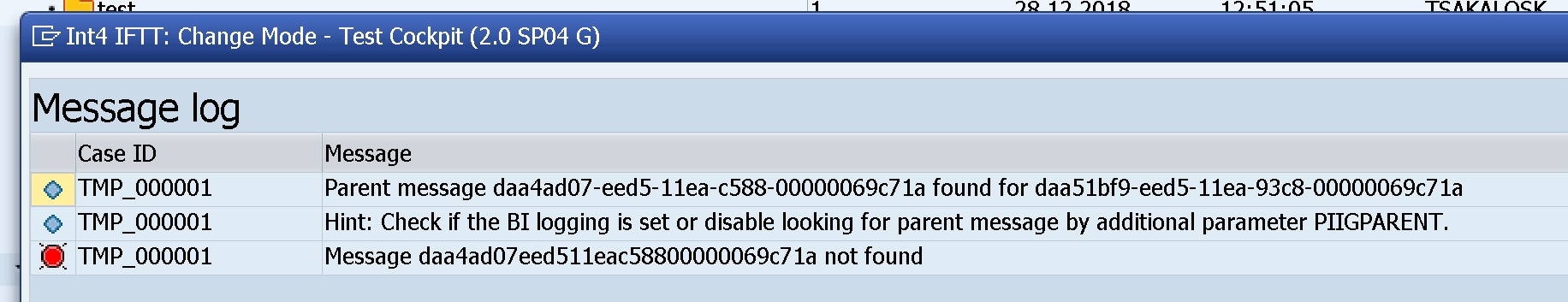 Error message: "Parent message: X found for Y", "Hint: Check if the BI logging is set or disable looking for parent message by additional parameter PIIGPARENT"