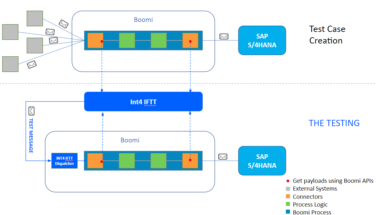 Boomi standard APIs are utilized to fetch the payloads from the AtomSphere in order to create and run the test cases. The following snapshot presents what happens in general during test case creation on the top. As well as the execution in case where the Dispatcher is utilized.